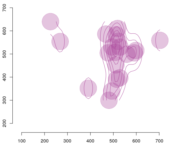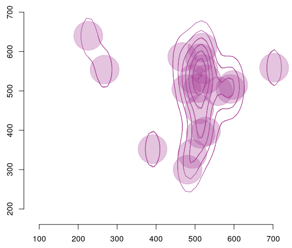 Today I experimented with the good old contour plots in R. I plotted my points rather large, because there is quite some uncertainty around their precise placement. In this particular case, I start with an empty plot and a custom range, and add the points separately. Note the cex=8 to draw extra large points.