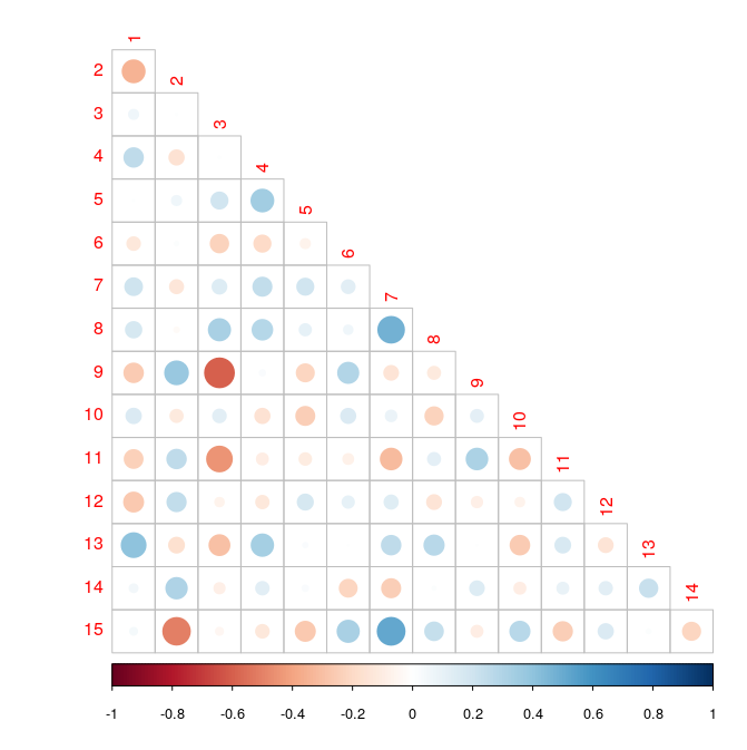 corrplot(object_with_many_variables, method="circle", type="lower", diag=FALSE)