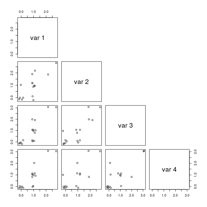 pairs(cbind(var1, var2, var3, var4) , upper.panel=NULL)