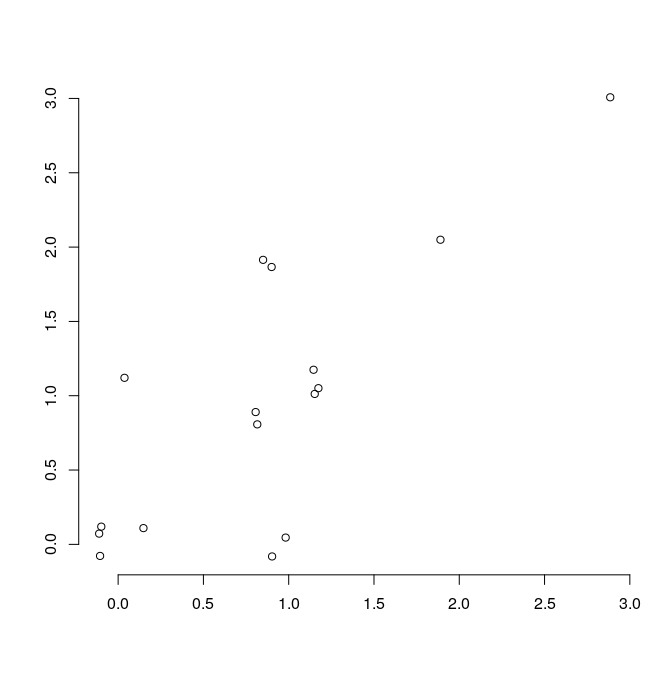 Correlations are some of the basics in quantitative analysis, and they are well suited for graphical examination. Using plots we can see whether it is justified to assume a linear relationship between the variables, for example. Scatter plots are our friends here, and with two variables it is as simple as calling plot() in R: