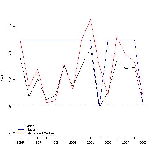 To illustrate the difference, here a simple plot using data from the SOM project. Here I use the positional variable (all actors in Austria combined) by year. It is immediately apparent that the three ways to express central tendency are different. The median position (in blue) is clearly constrained by the categories available (in this case -1, -0.5, 0, 0.5, 1). With its corrections, the interpolated median offers much more details of changes over time.