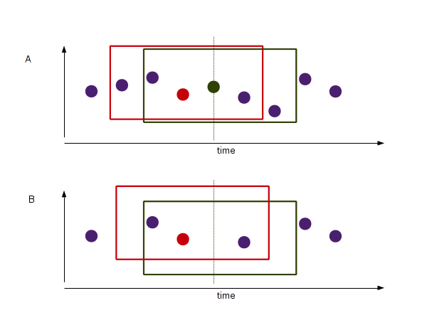 With holes in the data (situation at the bottom), we can use all the data available in a given window. This means that sometimes we use many numbers, and sometimes we have just a few. In this example, the average calculated for the red and green position is the same; with the green line indicating the here absent green dot.