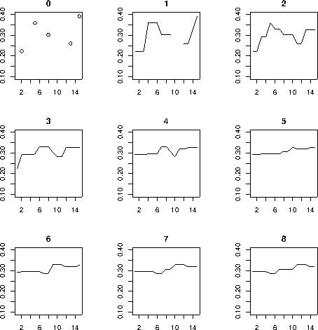 The value for k determines the width of the time window. The following graph illustrates how different values for k play out in these data. With k=0, only the actual data are shown. With k=1, the data are also applied to the point before and after; with k=2 we get a contiguous time series: Each point is the average of all available data points within a (moving) window that includes two values before and two values after, and the point itself, of course. The higher the value of k, the closer we get to the mean across all time points (i.e. a flat line).