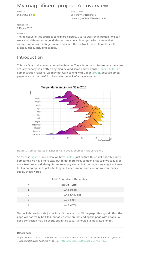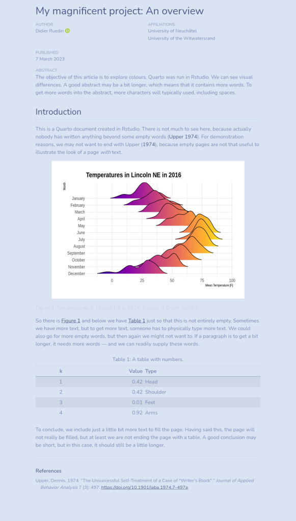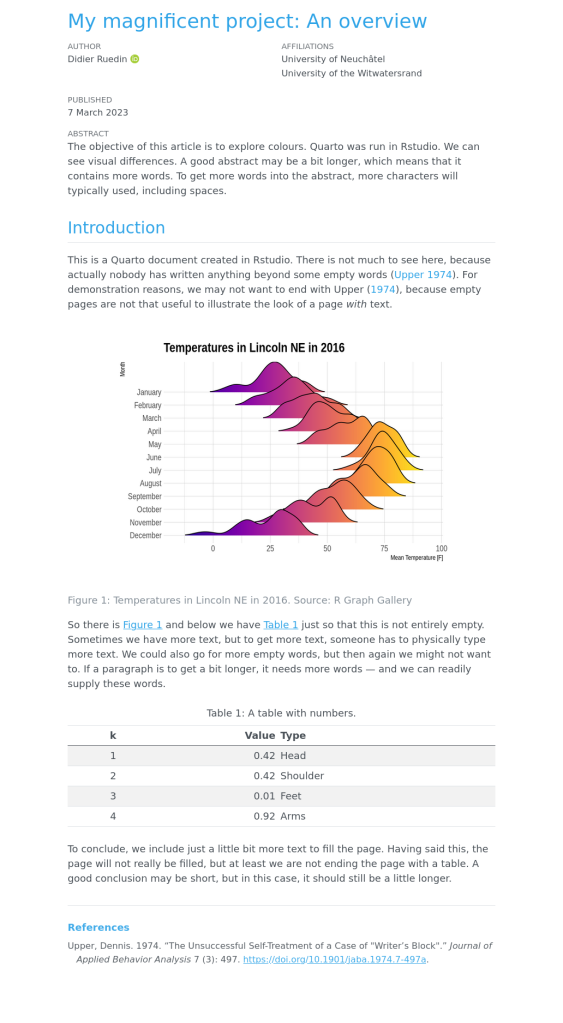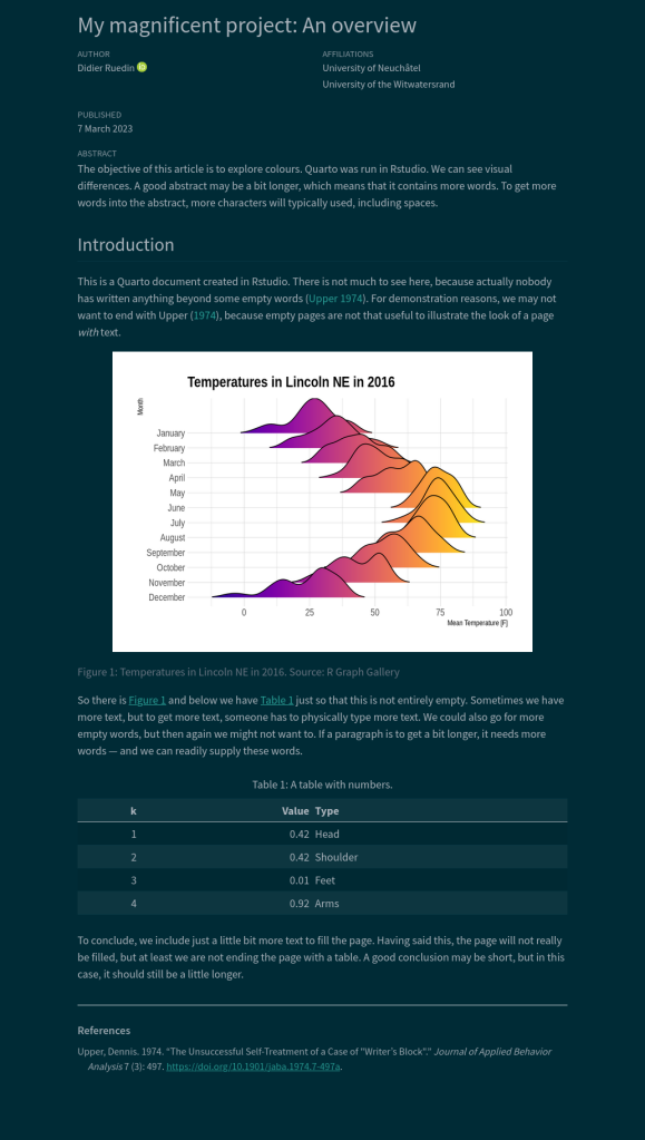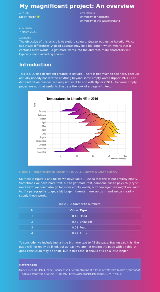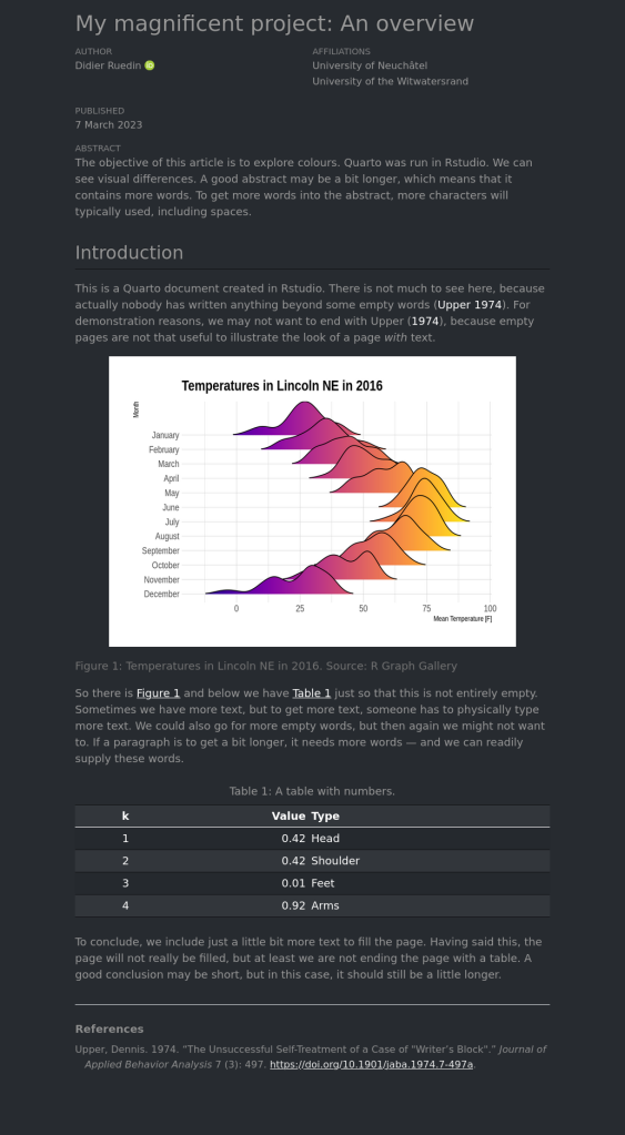 Quarto comes with several HTML themes built in. They are documented, but coming from the Bootswatch project, the existing documentation doesn’t give a good impression of what each theme looks like when used for an article.