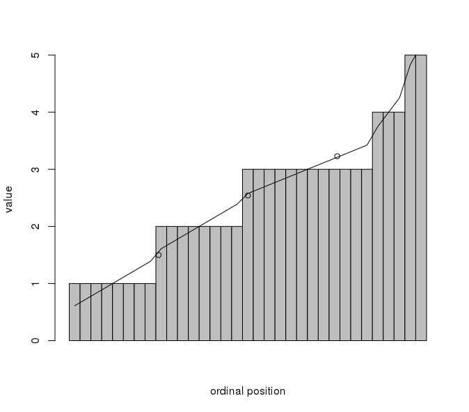 Now, if you were thinking that the measure of central tendency does not matter, here’s a bunch of distributions (as histograms because of the small number of observations in these examples, say of levels of education), along with their mean (blue line), median (red line), and interpolated median (dashed black line). We can see that in some configurations the choice of central tendency makes no difference at all, in others there is a small difference, and in others still the differences are substantive. It’s these substantive differences we should be worried about.