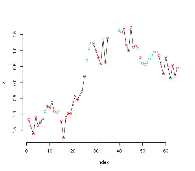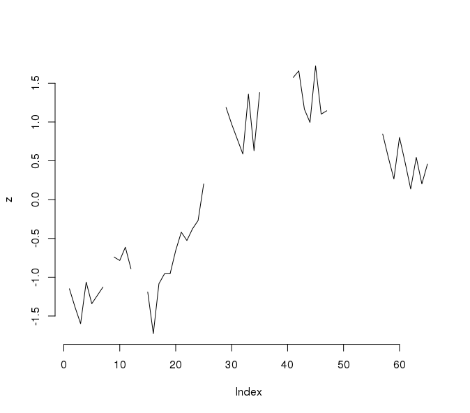 z <- c(-1.1484, -1.3842, -1.5985, -1.0626, -1.3413, -1.2341, -1.1269, NA, -0.7411, -0.7840, -0.6125, -0.8912, NA, NA, -1.1912, -1.7271, -1.0841, -0.9555, -0.9555, -0.6554, -0.4196, -0.5268, -0.3767, -0.2695, 0.2019, NA, NA, NA, 1.1880, 0.9736, 0.7807, 0.5878, 1.3594, 0.6306, 1.3809, NA, NA, NA, NA, NA, 1.5738, 1.6595, 1.1665, 0.9950, 1.7238, 1.1022, 1.1451, NA, 0.7807, NA, NA, NA, NA, NA, NA, NA, 0.8450, 0.5449, 0.2662, 0.8021, 0.4806, 0.1376, 0.5449, 0.2019, 0.4592)